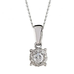 9kt white gold illusion set diamond pendant set with round brilliant cut diamonds totalling 0.15ct Metal : White Gold Karat: 9kt Stone: Diamond Diamond: round brilliant cut diamonds totaling 0.15ct H-J/SI Setting : 0.50ct Illusion setting Excludes the Chain. Chain sold separately.