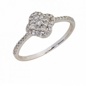 9kt White gold Flower Halo Set ring set with round brilliant cut diamonds Metal : White Gold Karat: 9kt Stone: Diamond Diamonds :round brilliant cut diamonds = 0.31CT Setting : Halo Size: N