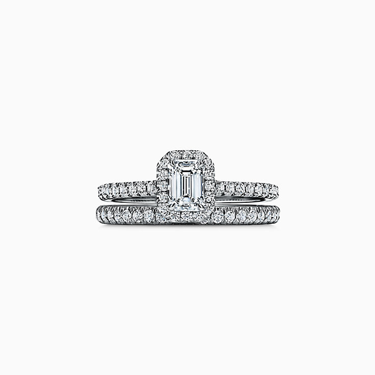 Emerald Cut Halo Diamond Ring with matching eternity band to make that complete wedding set for her.