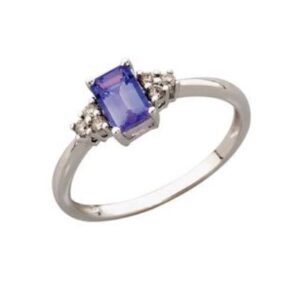 9kt White Gold Baguette Tanzanite & Diamond Ring 9kt white gold tanzanite ring with diamonds surrounding, finger size M. 1 baguette shaped tanzanite totalling 0.57ct and 6 round brilliant cut diamonds totalling 0.09ct. Diamond colour is ...